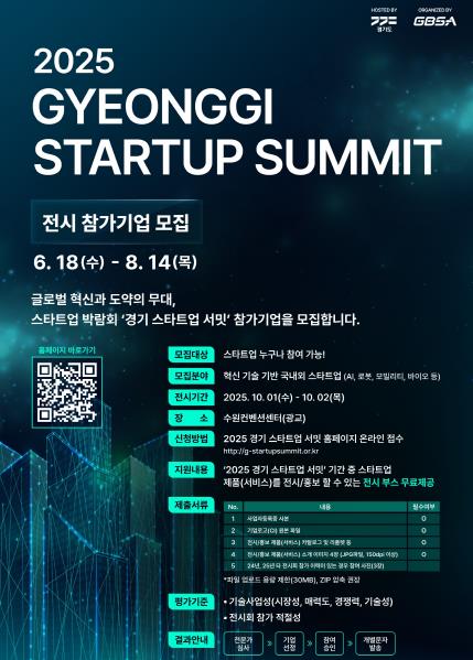 [뉴스서치] 경기도와 경기도경제과학진흥원은 오는 8월 14일까지 ‘2025 경기 스타트업 서밋’에 참가할 유망 스타트업을 모집한다. 이번 행사는 10월 1일부터 2일까지 수원컨벤션센터(광교)에서 열리며, 유럽과 미주 지역의 글로벌 투자기관과 협업해 경기도 스타트업의 세계 진출을 지원한다.