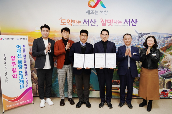 시는 20일 충청남도가 주관하는 ‘효행 2030 어르신 봉양 프로젝트’ 공모 사업에 선정돼 시청 시장실에서 한서대학교 LINC 3.0 사업단과 업무 협약식을 개최했다고 밝혔다.