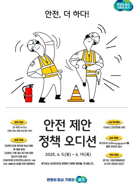 [뉴스서치] 경기도가 6월 5일부터 19일까지 전국민을 대상으로 ‘안전제안 정책오디션 2025’ 공모전을 진행한다.