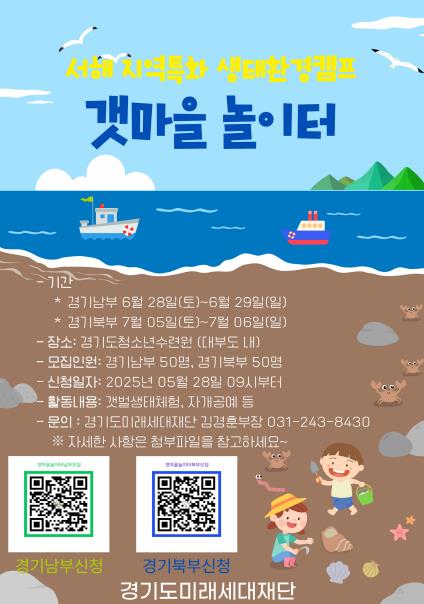 [뉴스서치] 경기도미래세대재단은 28일부터 서해 지역특화 생태환경 캠프 ‘갯마을 놀이터’ 참가자를 선착순 모집한다.