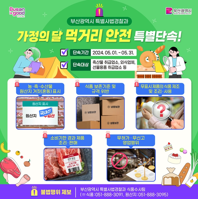 박형준 시장은 “가정의 달을 맞아 5월 한 달간 가족 단위 외식 수요가 늘 것으로 예상됨에 따라 시민의 먹거리 안전을 확보하고자 이번 수사를 기획했다”라며, “시민의 건강에 위협이 될 수 있는 식품 관련 불법행위에 대해서는 관계 법령에 따라 엄정하게 조치할 예정이다”라고 밝혔다.