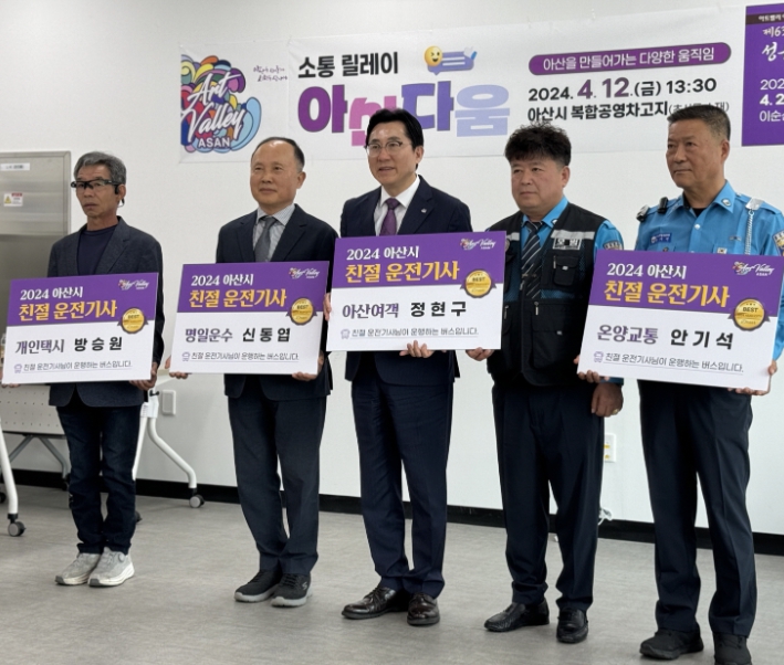 아산시 대중교통과 관계자는 “운수종사자들에게 친절 분위기가 빠르게 전파될 수 있도록 친절운전기사 차량에 인증서를 상시 게시하고 매월 선정되는 친절운전기사를 대상으로 연말 심사를 거쳐 10명 내외의 ‘스마일운전기사’를 선발해 표창과 함께 해외연수 기회를 부여할 계획”이라고 밝혔다.
