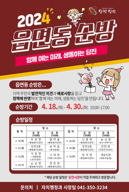 순방은 오전 10시와 오후 2시에 2곳의 읍면동에서 진행하며 △4.18 우강면, 합덕읍 △4.22 당진3동, 송악읍 △4.23 석문면, 고대면 △4.24 순성면, 면천면 △4.26 신평면, 송산면 △4.29 당진2동, 당진1동 △4.30 정미면, 대호지면 순으로 진행할 예정이다. 자세한 사항은 당진시청 누리집 공지사항을 참고하면 된다.