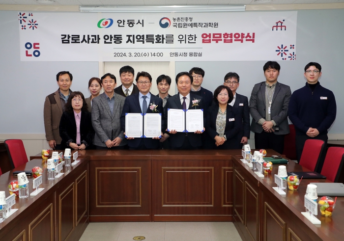 [뉴스서치] 안동시는 20일 안동시청 융합실에서, 농촌진흥청 국립원예특작과학원과 국내육성 신품종 사과 ‘감로’의 지역특화를 위한 업무협약(MOU)을 체결했다.