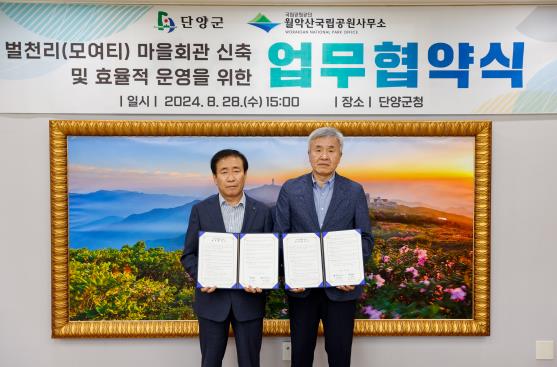 [뉴스서치] 단양군과 월악산국립공원사무소는 지난 28일 ‘단성면 벌천리 모여티 마을회관 신축 및 활성화’를 위한 업무협약을 체결했다.