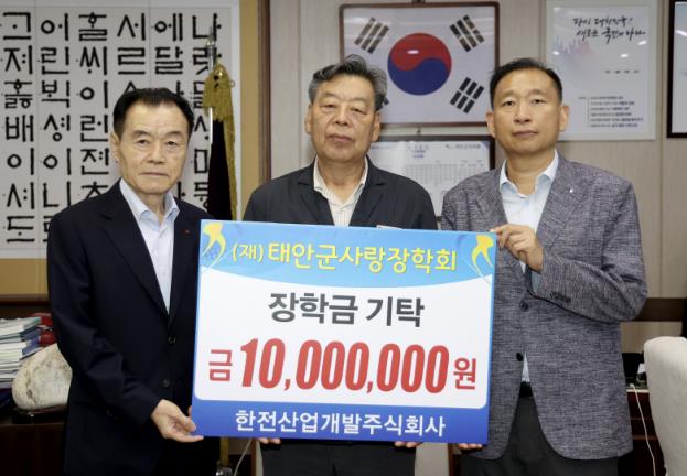 군에 따르면, 한전산업개발(주) 노충호 에너지사업본부장과 직원들은 9일 군청 군수실에서 가세로 군수 등이 참석한 가운데 기탁식을 갖고 장학금 1천만 원을 (재)태안군사랑장학회에 기탁했다.