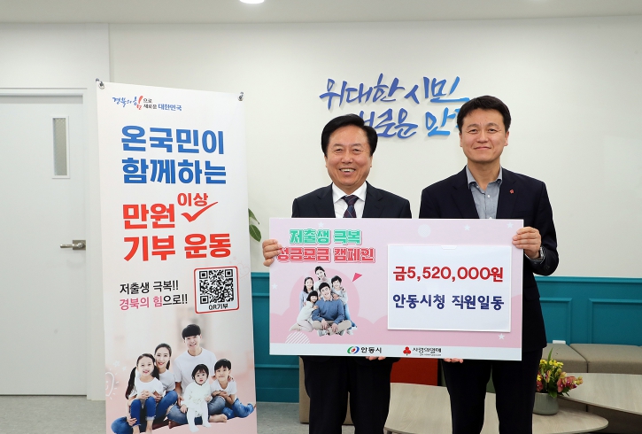 안동시청에서는 경상북도의 저출생과의 전쟁 선포(24.1.18.)에 따라 경북 저출생 극복 성금모금 캠페인’의 일환으로 전개되고 있는, ‘온국민이 함께하는 만원(이상) 기부 운동’에 공직자가 솔선하고자 자발적인 모금을 진행했고, 그 결과 총 552만 원을 모금했다.