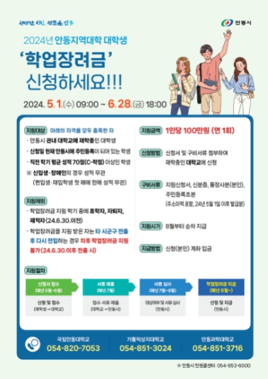[뉴스서치] 안동시(시장 권기창)는 5월 1일부터 ‘2024년 안동지역대학 대학생 학업장려금 지원사업’신청자를 접수한다.