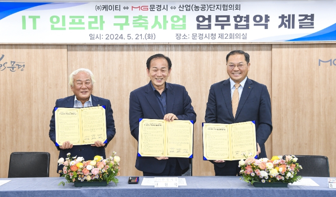 [뉴스서치] 문경시는 5월 21일 시청 제2회의실에서 산업(농공)단지 내 IT인프라 구축사업을 위해 ㈜케이티, 산업(농공)단지협의회와 업무협약을 체결했다.