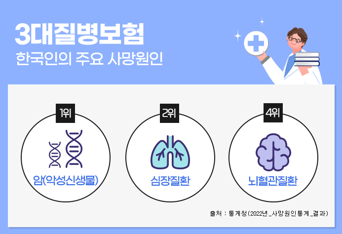 [뉴스서치] 3대질병으로 일컬어지는 암, 뇌혈관질환, 심혈관질환은 한국인의 주요 사망원인에서 상위를 차지하고 있으며, 이에 대한 진단비를 집중적으로 보장해 주는 보험상품을 3대질병진단비 보험이라 할 수 있다.