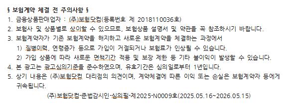 보다 자세한 가입 조건이나 적정 진단금액 설정은 비갱신형 암보험 비교사이트를 활용하여 여러 회사의 상품을 실시간으로 보험료 비교도 해볼 수 있으며, 다양한 정보를 비대면으로 주말까지 전문가와 상담이 가능하므로 3대진단비 등 종합건강보험 가입 시 편리하게 이용할 수 있다.
