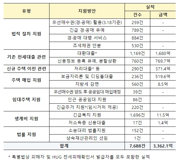 그간 위원회에서 최종 의결한 전세사기피해자등 가결 건은 총 14,001건(누계),긴급 경・공매 유예 협조요청 가결 건은 총 795건(누계)으로, 결정된 피해자등에게는 주거, 금융, 법적 절차 등 총 7,688건(누계)을 지원하고 있다.