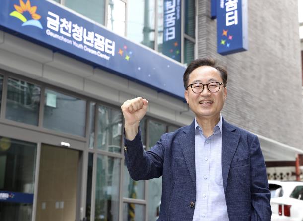 ▲ 유성훈 금천구청장이 금천청년꿈터 앞에서 사진 촬영을 하고 있다