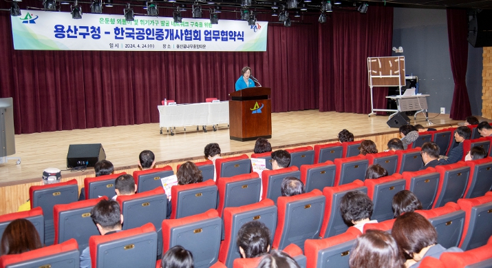 박희영 용산구청장이 24일 오전 9시 30분 용산꿈나무종합타운 5층 ‘꿈나무 극장’에서 한국공인중개사협회 용산구지회와 ‘개업공인중개사와 함께하는 은둔형 외톨이 및 위기가구 발굴 네트워크 구축 사업’ 업무협약을 체결했다.