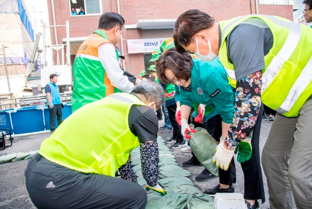 ▲ 5월 9일 원효빗물펌프장에서 2024년 풍수해 대비 민관합동훈련에서 박희영 용산구청장이 모래주머니를 쌓고 있다 |