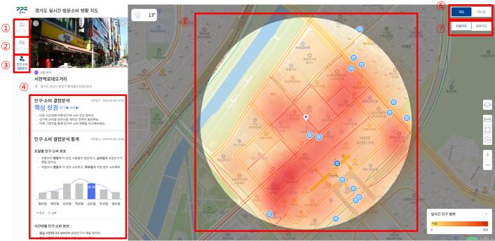 ‘실시간 방문소비 현황지도’는 경기도 주요 지역의 5분 단위 인구 밀집도와 1시간 단위 소비 데이터를 지도 기반으로 시각화해 제공한다. 현재 어느 지역에 인구가 집중돼 있는지, 어떤 업종에서 소비가 활발한지를 확인할 수 있어, 나들이·이동 경로 조정이나 행사 밀집도 관리, 상권 분석 등에 유용하다. 단, 데이터 처리 시간으로 인해 실시간 인구는 15분, 소비 데이터는 35분 지연된 정보를 제공한다.