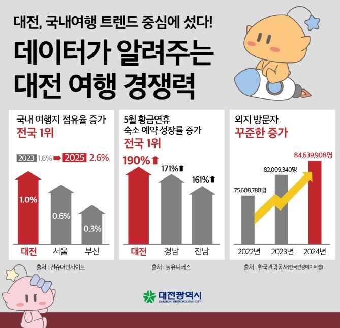 또한 한국관광공사의 2024년 지역별 방문객 통계에 따르면, 대전 방문객은 총 8,463만여 명으로 전년 대비 3.1% 증가했다.
