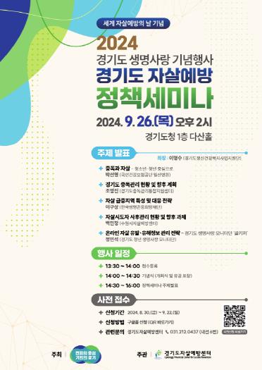 [뉴스서치] 경기도가 오는 26일 경기도청 1층 다산홀에서 세계 자살예방의 날(9월 10일)을 기념한 정책세미나를 개최한다.