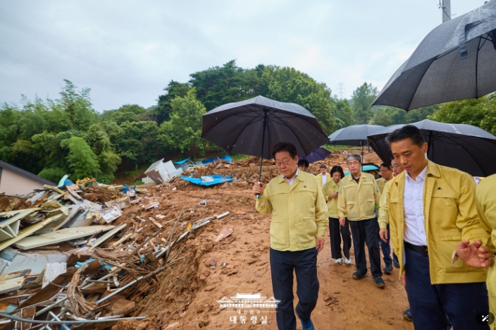이어 이 대통령은 산사태 피해가 발생한 산청읍 부리 복구 현장을 방문해 산림청장으로부터 피해 및 복구 상황을 보고받고, 현장 관계자들을 격려했다.