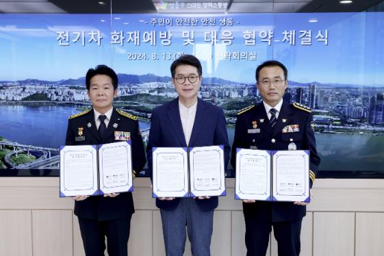 ▲ 성동구는 8월 13일 성동구는 성동소방서, 성동경찰서와 ‘성동구 전기차 화재 예방 및 대응 업무협약’을 체결했다. |