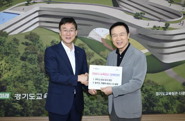 ▲ 이민근 안산시장(사진 왼쪽)이 2024년 5월31일 임태희 경기도교육감(오른쪽)을 만나 과학고 유치 등 교육계 현안 건의문을 전달했다 |