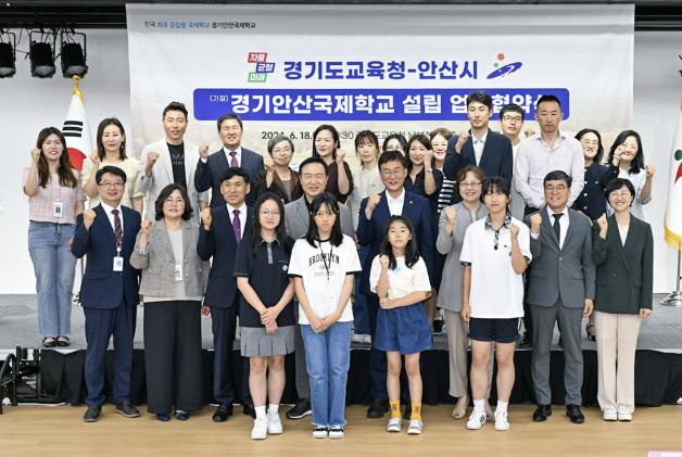 ▲ 민선8기 안산시는 교육은 도시의 미래를 가늠하는 척도이자 교육의 경쟁력이 곧 안산의 경쟁력이라는 기조하에 다양한 현안 사업에 집중하고 있다. 사진은 지난 6월 18일 경기도교육청에서 경기안산국제학교 설립 업무협약식에서 학생들과 교육청 관계자들이 함께 파이팅을 외치며 기념촬영을 하고 있는 모습 |
