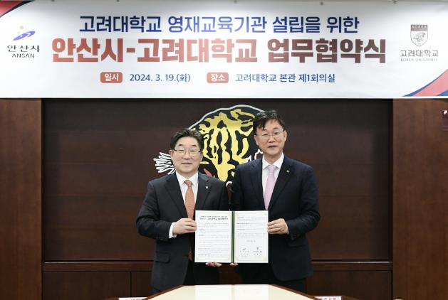 ▲ 고려대학교 안산병원 내 미래 인재를 양성하는 영재교육원이 들어선다. 사진은 2024년 3월 19일 이민근 안산시장(오른쪽)과 김동원 고려대학교 총장(왼쪽)이 미래인재 양성을 위한 영재교육기관 설립 업무협약을 체결한 뒤 기념촬영을 하고 있는 모습 |