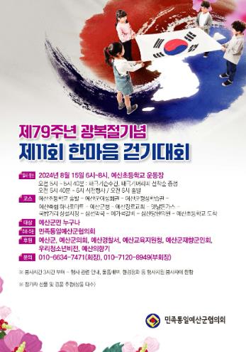 [뉴스서치] 예산군은 민족통일예산군협의회가 주관하는 제79주년 광복절 기념 한마음 걷기대회를 오는 8월 15일 예산초등학교에서 개최한다고 밝혔다.
