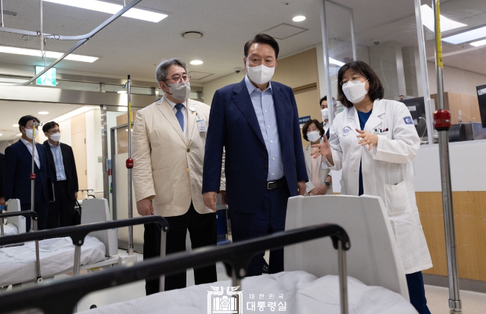 ▲ 9월 4일 윤석열 대통령은 저녁 8시 50분 쯤 의정부 성모병원 권역응급의료센터를 방문해 1시간 20분 가량 머물며 국민 건강을 위해 헌신하고 있는 의료진을 격려하고 현장의 의견을 청취했다. |
