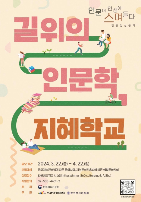 문체부 이해돈 문화정책관은 “인문학은 인공지능(AI), 디지털로 대표되는 기술 발전에 대한 불안과 희망의 상존, 인간관계의 단절·파편화로 인한 우울감·고립감 심화 등의 현상을 맞이하고 있는 우리에게 필요한 인간과 사회에 대한 깊은 통찰력과 공감 능력을 길러주고, 삶의 의미와 방향을 찾을 수 있도록 도와주는 나침반과 같은 역할을 한다.”라며, “누구라도 가까운 문화시설에서 인문의 가치를 접할 수 있는 ‘길 위의 인문학’과 ‘지혜학교’ 사업에 역량 있는 프로그램 기획자와 문화시설 운영자가 많은 관심을 갖고 참여하길 바란다.”라고 밝혔다.