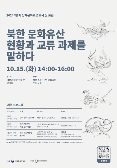 문체부는 남북 문화교류 협력 기반을 마련하고자 남북 문화예술의 차이를 살피고 향후 문화공동체 회복 방향을 모색하는 ‘남북문화교류 교육 및 포럼’을 올해 12월까지 총 4차례 개최한다. 지난 9월, ‘남과 북의 언어를 말하다’를 주제로 제2차 행사를 개최한 데 이어 이번 3차 행사에서는 ‘북한 문화유산 현황과 교류 과제를 말하다’를 주제로 강연과 토론을 진행한다.