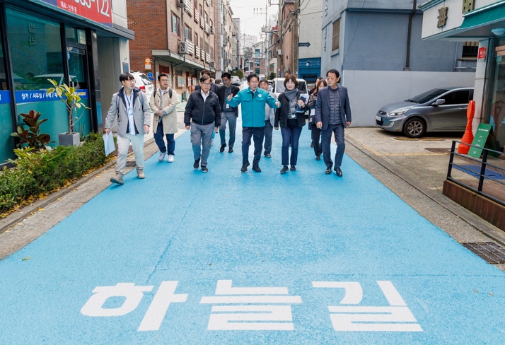 ▲ 연한 파란색으로 칠해진 합정 하늘길 도로를 점검하고 있는 박강수 마포구청장