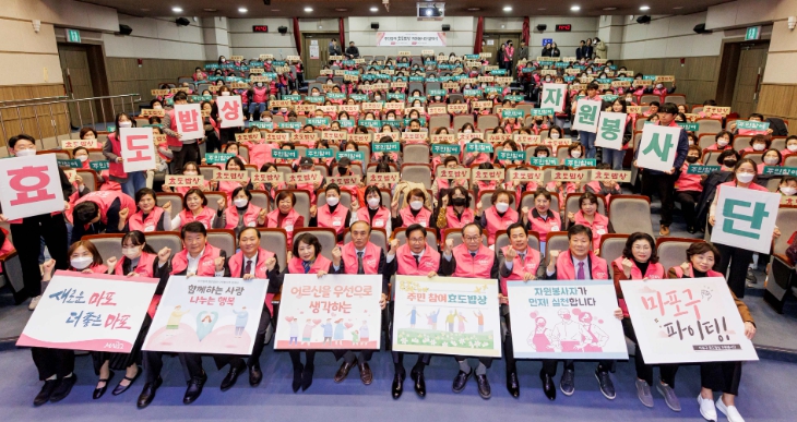 ▲ 지난해 3월 각동에서 모인 주민참여 효도밥상 자원봉사자 발대식이 열렸다. |