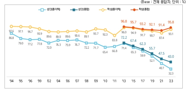 조사 결과에 따르면 지난 1년간(2022. 9. 1.~2023. 8. 31.) 초·중·고교 학생의 종합독서율은 95.8%, 연간 종합독서량 36.0권으로, ’21년과 비교하면 독서율은 4.4%포인트, 독서량은 1.6권 증가한 것으로 나타났다. 성인의 경우 종합독서율은 43.0%, 종합독서량은 3.9권으로 ’21년에 비해 각각 4.5%포인트, 0.6권 줄어들었다.