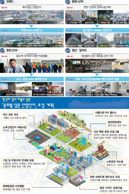 둘째, 산업단지 내 문화·편의시설을 확충하고 경관을 개선해 산단의 일상 공간을 문화공간으로 재창조한다. ▲산단 입지 제도를 개편해 문화·체육시설과 식당·카페(Food & Beverage) 시설을 확대한다. 공공체육시설용 토지의 조성원가 분양, 공장 내 부대시설로 카페 등 설치 허용 등이 추진된다.