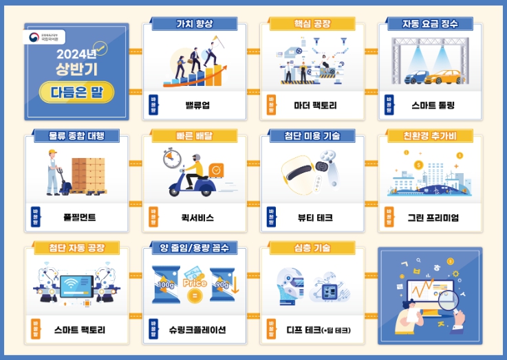 2024년 상반기에 다듬은 말 가운데 가장 잘 바꾸었다고 국민이 선택한 말은 ‘가치 향상’이었는데 응답자의 89.0%가 긍정적으로 평가했다. ‘가치 향상’은 ‘기업이나 조직 등의 가치를 높이려고 제품, 서비스, 시스템, 조직 문화 등 다양한 측면에서 노력하는 것’을 뜻하는 말로 ‘밸류업’을 알기 쉽게 다듬은 말이다. 이 밖에도 국민은 ‘자동 요금 징수(스마트 톨링)’, ‘물류 종합 대행(풀필먼트)’, ‘첨단 미용 기술(뷰티 테크)’ 등을 잘 다듬어진 말로 선택했다.