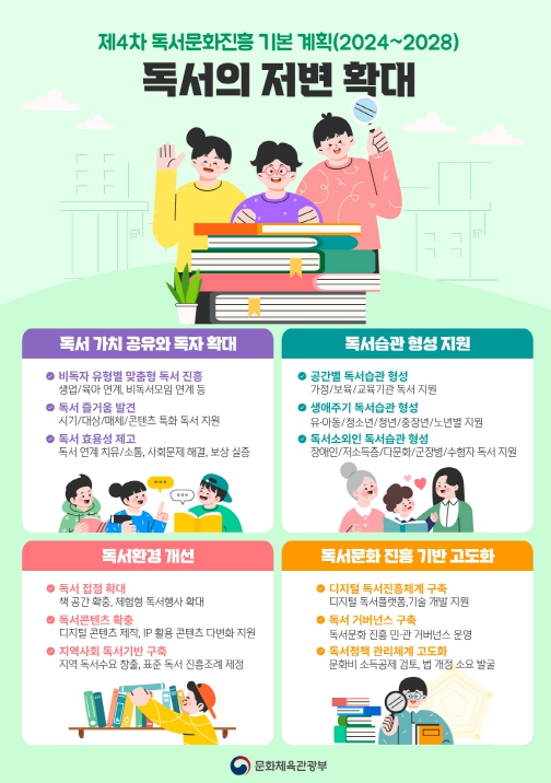 [뉴스서치] 문화체육관광부는 '독서문화진흥법'에 따라 5년마다 수립·시행하는 ‘제4차 독서문화진흥 기본계획(2024~2028)’을 발표했다.