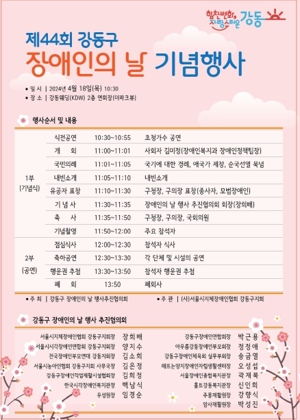 [뉴스서치] 강동구가 ‘제44회 장애인의 날’을 기념해 오는 4월 18일 강동웨딩KDW(천호대로 1102)에서 기념행사를 개최한다고 밝혔다.