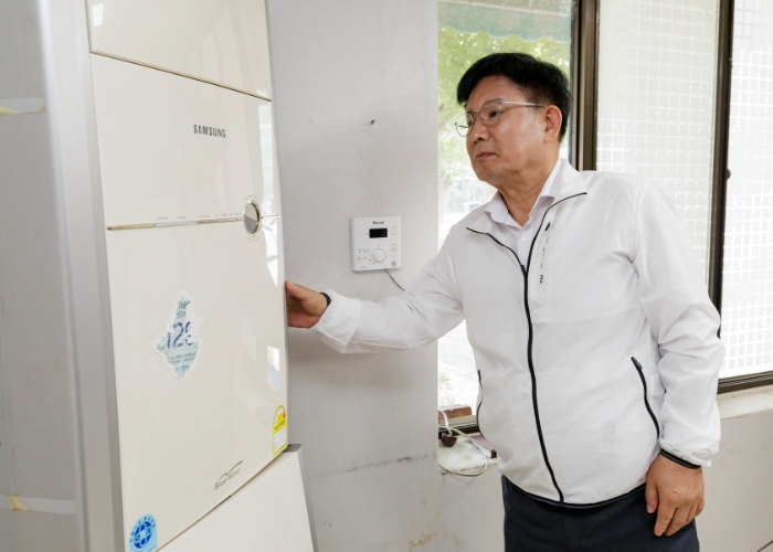 | ▲ 박강수 마포구청장이 경로당을 방문해 노후 냉방 시설을 확인하고 있다. |
