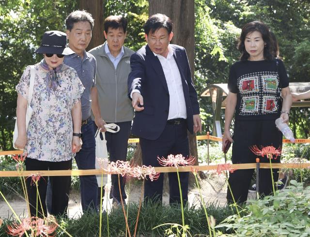 ▲ 박강수 마포구청장(왼쪽에서 네 번째)이 주민들과 함께 만개한 상사화를 감상하고 있다 |