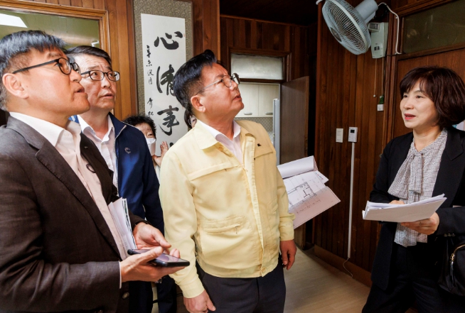 ▲ 지난해 희우경로당을 방문해 노후 냉방 시설을 확인하고 개선을 지시하는 박강수 마포구청장 |