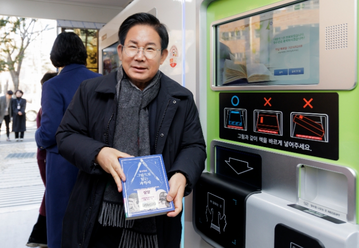 ▲ 박강수 마포구청장이 마포상암 스마트도서관 무인대출반납기에서 책을 빌리고 있다. |