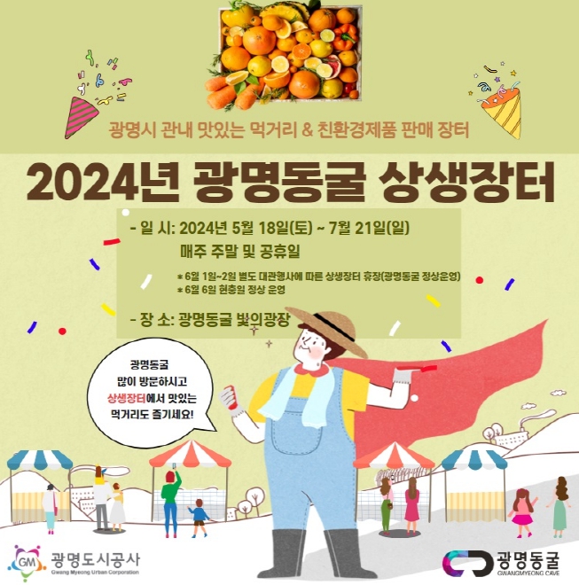 2024년 광명동굴 상생장터는 광명사협 소속 우수 판매업체들이 참여하여 광명동굴 관람객들의 입맛을 사로잡을 먹거리와 친환경 제품 판매가 이루어지는 장터이다. 이번 상생장터를 통해 참여 부스들은 관내 유수 관광지를 통한 새로운 판로를 개척할 수 있을 것으로 보인다. 관람객들은 동굴 관람과 함께 보다 다양한 먹거리를 통한 색다른 즐거움을 얻고, 우수한 친환경 제품 구매로 탄소중립 실천에 함께할 수 있을 것으로 기대된다.
