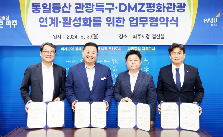 [뉴스서치] 파주시는 지난 3일 시청 접견실에서 ‘통일동산 관광특구·디엠지(DMZ)평화관광 연계·활성화를 위한 업무협약식’을 개최했다.