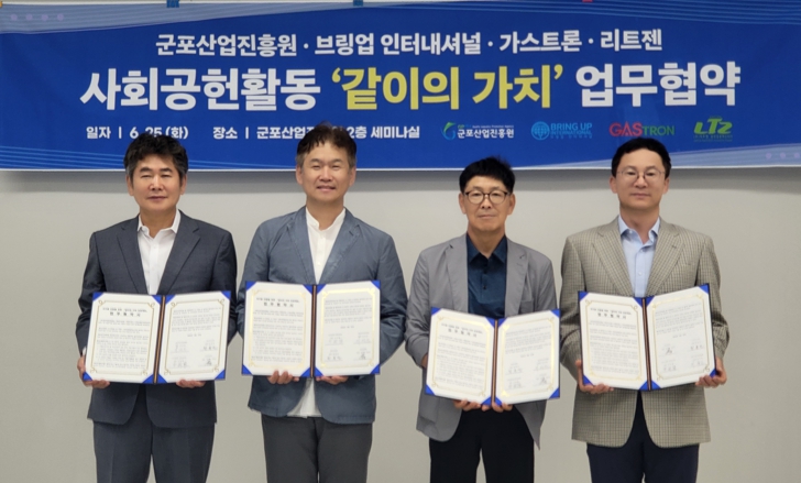 [뉴스서치] 군포산업진흥원은 25일 ㈜가스트론, ㈜리트젠, (사)브링업인터내셔널과 사회공헌활동 사업을 위한 업무협약을 체결했다.