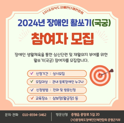[뉴스서치] (사)충청북도장애인단체연합회 증평군지부에서‘장애인 활쏘기(국궁) 교실’참여자를 연중 상시 모집한다.