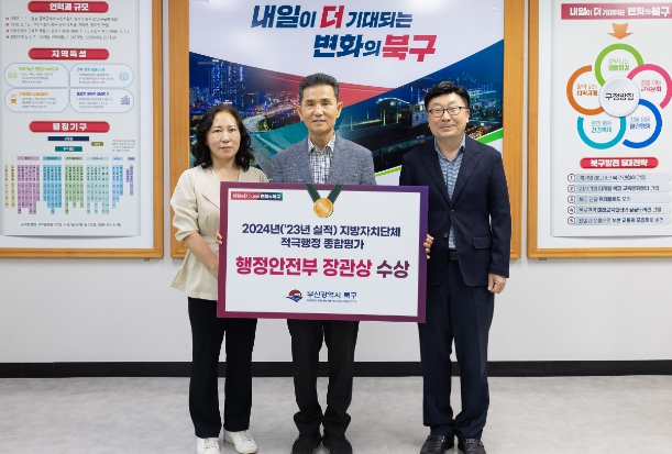 북구는 적극행정 우수공무원 선발, 적극행정 마일리지제도 등 다양한 시책들을 통해 조직 내 적극행정 문화를 확산시키고, 빈집터를 활용하여 치매예방을 위한 텃밭을 조성한 '기억이 꽃피는 텃밭', 버려지는 유아용품을 재활용하는 '다시쓰기 행복 키즈마켓 '조성 등 주민이 체감하는 행정을 위해 적극적으로 노력한 점에 높은 평가를 받아 우수 기관으로 선정되어 부산시 구·군 중 유일하게 행정안전부 장관상을 수상하게 됐다.