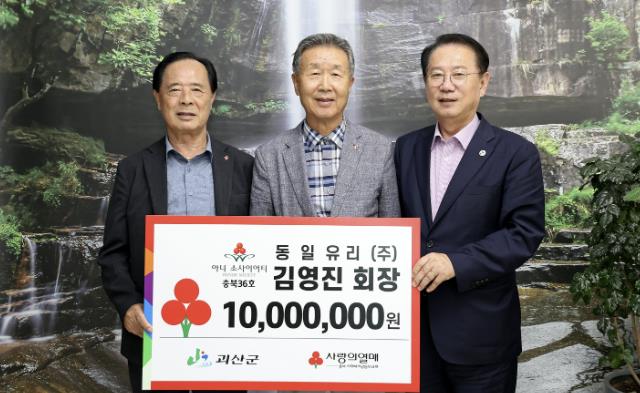 [뉴스서치] 동일유리(주) 김영진 회장은 지난 3일 괴산군청을 방문해 저소득층을 위한 성금 1천만 원을 기탁했다.