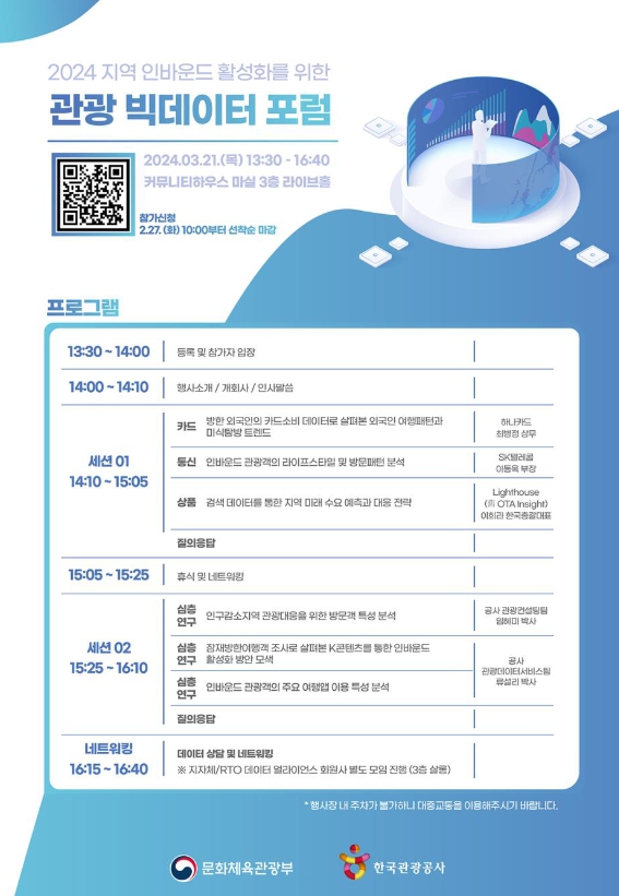 [뉴스서치] 문화체육관광부는 한국관광공사와 함께 3월 21일, 커뮤니티하우스 마실(명동)에서 ‘데이터가 이끄는 지역 방한 관광객 유치 및 활성화 방안’을 주제로 ‘관광 빅데이터 포럼’을 개최한다.