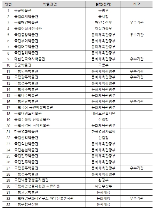 ▲ 국립박물관 평가 인증기관 목록[박물관명: 평가인증 대상기관 고시(’23. 1. 31.) 연번 순] |